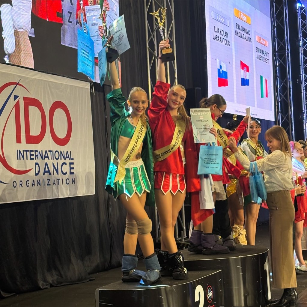 Čeprav šola praviloma ne objavlja rezultatov, doseženih v okviru klubskih dejavnosti, tokrat z veseljem naredimo izjemo. Tri naše učenke so na svetovnem prvenstvu v plesu dosegle vrhunske rezultate in stopile na zmagovalne stopničke – uspeh, ki presega vsakdanji tekmovalni okvir ter predstavlja izjemen dosežek na mednarodni ravni.