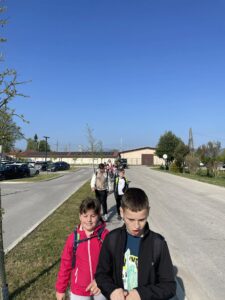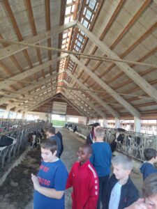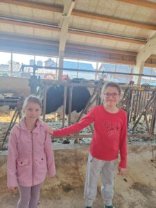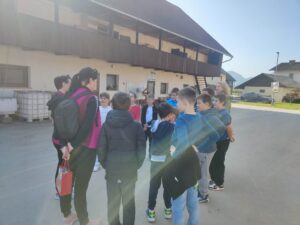 Že kar zjutraj smo imeli malo telovadbe, saj smo se sprehodili proti kmetiji, ki je nedaleč stran od železniške postaje v Šempetru. Od daleč smo zagledali napis KMETIJA FLIS, ki nam je pogrel srca, saj njihove izdelke že poznamo iz šole, kjer si želodčke razvajamo z njihovim mlekom, kefirjem in sadnimi jogurti. Sprejela nas je prijazna ga. Darija, ki nam je razkazala njihovo kmetijo. Ogledali smo si hlev, v katerem skrbijo za 180 glav živine. Razkazala nam je kmetijsko mehanizacijo, pokazala tudi teličke, goveda pasme Black Angus, njihovo ‘porodnišnico’ in ločevanje teličkov po starosti na ‘vrtec’, ‘osnovno šolo’, ‘srednjo šolo’ in ‘fakulteto’. Ogledali smo si tudi molzni stroj, ki na kmetiji Flis obratuje 24 ur na dan. Pogovarjali smo se o vzorcih na živalih, skrbjo za toliko živali, hranjenje krav, proces molžnje, proces pridelave mlečnih izdelkov in še kaj.