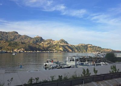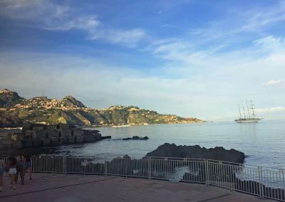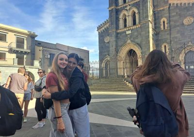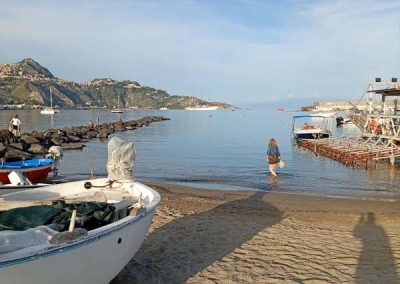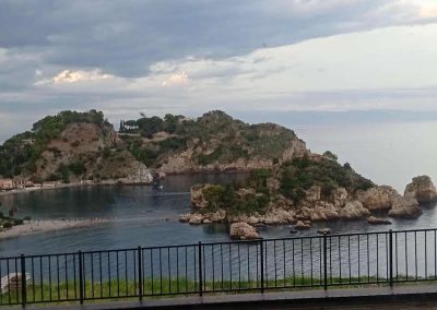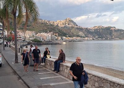 Kot češnja na torti pa nas je čakal še nepričakovan dodatek – obisk Taormine in čarobne Isole Belle. Taormina, eno najlepših mest na Siciliji, nas je očarala s svojim živahnim mestnim utripom in ozkimi ulicami, polnimi cvetja. Mesto že stoletja navdihuje umetnike, pisatelje in glasbenike. Nekaj kilometrov nižje smo se ustavili še pri Isola Bella, majhnem otočku, povezanem s kopnim z ozkim pasom peska. Ta “lepi otok”, kot pove že ime, je pravi naravni dragulj, obdano z modrino Jonskega morja in bujnim zelenjem. Njegova plaža je ena najlepših na Siciliji, z vodo tako kristalno čisto in toplo, da smo ob namakanju nog skoraj pozabili, da je oktober.